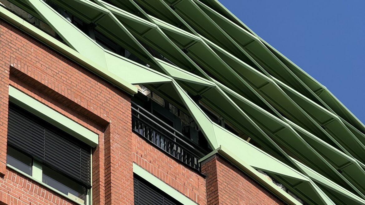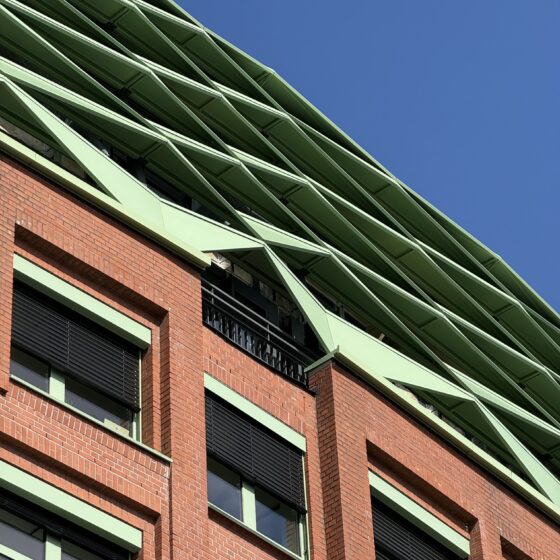 In enger Abstimmung mit der Stadtplanung ist eine neue Dachausbildung entwickelt worden. Eine zeichenhafte Metallstruktur überzieht die Dachgeschosse zu einem einheitlichen Korpus. Metallelemente sorgen für einen hervorragenden Ausblick zum Hafen und bieten gleichzeitig optimalen Sonnenschutz. Im Innenhof entsteht eine Gebäudeerweiterungen mit hochwertigen Aussenterrassen als angemessenes Gegenüber der im Hof befindlichen, denkmalgeschützten Fassade des Sloman-Hauses des Hamburger Architekten Fritz Höger.
