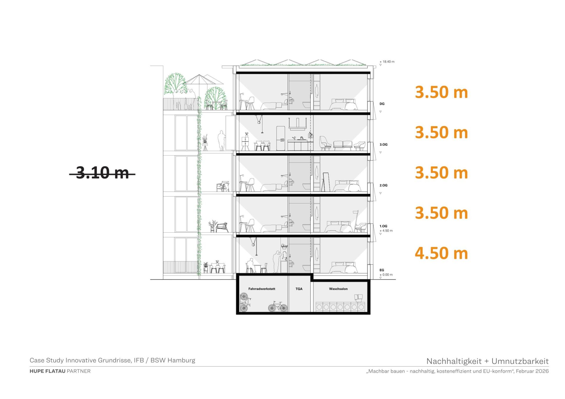 Sebastian Flatau von Hupe Flatau Partner warb aus Planer-Sicht für einen erweiterten Nachhaltigkeit-Begriff – nämlich mit dem Fokus, inwieweit Umnutzungen von Gebäuden ermöglicht werden: „Für das Unbekannte planen und bauen“. Einfachheit und Akzeptanz/Schönheit von Gebäuden sorgten automatisch für Langlebigkeit.
